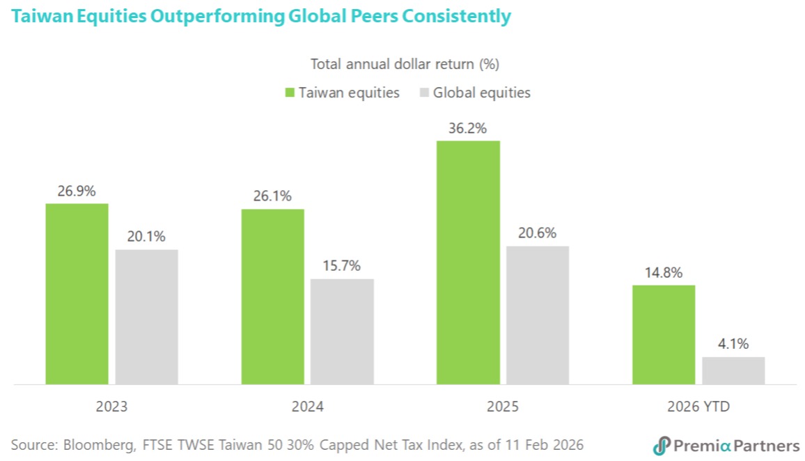 With many of the global leading high tech manufacturing players, the Taiwan stock market sits at the confluence of the global tech super cycle, robust earnings growth and modest valuations, and is home to many global leading Asian technology players. The fundamental tailwinds that drove the Taiwanese stock market’s outperformance from 4Q25 are likely to continue carrying the rally in 2026. Indeed, the Taiwan market appears to be in the early stages of its outperformance cycle. In this article, our Senior Advisor Say Boon Lim explores why in addition to TSMC, the blue chip cohort from Taiwan offers global investors a unique diversification opportunity, providing exposure to technology super cycle beyond US big tech names, complemented by its attractive valuations and low correlations with other major asset classes.