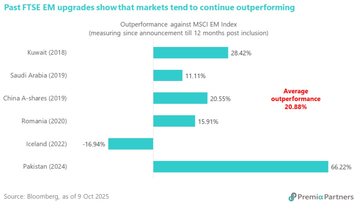 Vietnam’s long-awaited upgrade to Emerging Market (EM) status by FTSE Russell marks a pivotal milestone in the evolution of its capital markets. Yet, contrary to the notion that “the good news is already priced in,” history suggests it is far from too late to gain exposure. Past FTSE EM upgrades show that markets tend to continue outperforming well after the announcement—with Pakistan, Kuwait, China A-shares, Romania, and Saudi Arabia outperforming the MSCI EM Index by 66.22%, 28.42%, 20.55%, 15.91%, and 11.11%, respectively, in USD terms during the period from announcement to 12 months post-inclusion. Only Iceland proved an exception at -16.94%. These precedents highlight how structural inflows, valuation re-ratings, and improved investor access typically sustain positive momentum well beyond the initial upgrade news. In Vietnam’s case, the reclassification is just one milestone in a broader reform journey. Ongoing initiatives — including the rollout of a Central Counterparty Clearing (CCP) system, stronger corporate governance, digitalization of market infrastructure, and enhanced foreign access — signal a deepening commitment to transparency, efficiency, and sustainability. As Prime Minister Pham Minh Chinh has reiterated, Vietnam aims to build a market that meets global standards and supports long-term economic growth through efficient capital mobilization. With key reforms still progressing and passive EM fund inflows yet to commence, Vietnam’s re-rating cycle is likely in its early stages. Investors seeking to capture this structural opportunity may consider the Premia Vietnam ETF, which targets mid- to large-cap companies poised to benefit most from Vietnam’s EM inclusion and the ensuing wave of institutional participation.